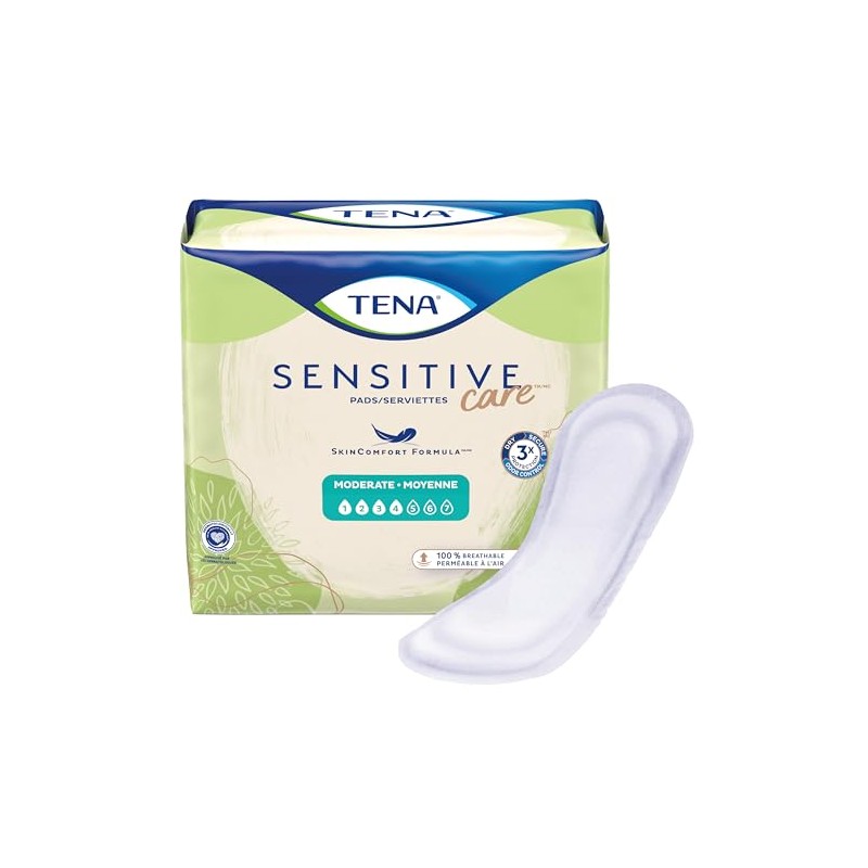 TENA Sensitive Care Moderate Regular Incontinence Pads are 100% breathable to help protect your sensitive, intimate skin when experiencing bladder leakage. These pads are designed with triple protection against bladder leaks, odor, and wetness for occasional moderate urine leakage. As opposed to period pads, these absorbent urine pads protect against moderate leaks from stress incontinence.