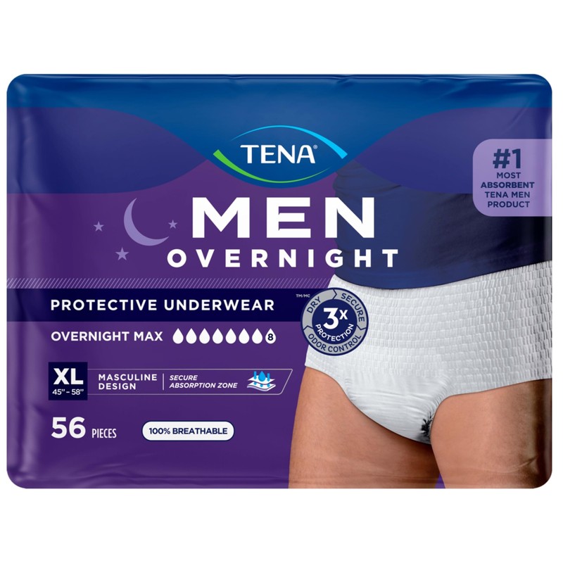 DescriptionTENA Men Overnight Max fully breathable underwear is white, soft and comfortable night incontinence underwear with a pullup fit just like regular underwear. Featuring a high-performance Double Absorption Core and leakage barriers, TENA Men Overnight Max quickly locks in moistureeven from larger leakshelping keep skin dry and protected all night long. The Secure Absorption Zone ensures Triple Protection from leaks, odor, and moisture. With a body close fit, this disposable night-time protective underwear stays in place even when moving and turning during the night. Made of soft, breathable materials that helps promote skin health for medium to heavy nighttime incontinence. Sleep with confidence by wearing the most absorbent overnight protection for men from TENA.