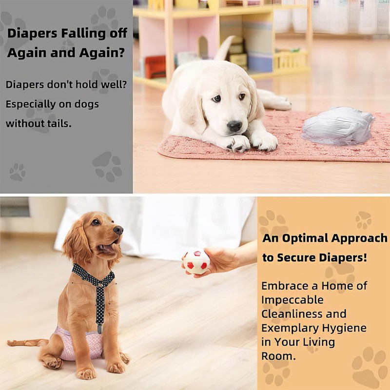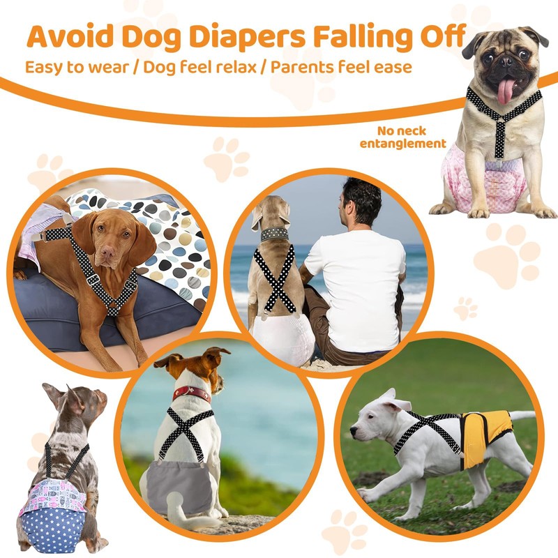 - 3-belt design: dog nappy braces straps there are 3 buckles that can firmly fix your pet's clothes and prevent it from falling off easily. First, put the straps in the correct position, then cross the two straps over the dog's back and connect the nappy. Second, tie the lower straps tightly and connect them to the nappy. The last step is The movable buckle to the correct length.