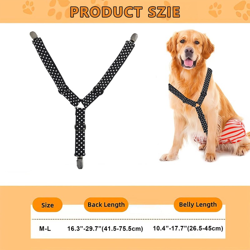 - Product features: dog braces back length 41.5-75.5 cm, belly length 26.5-45 cm, waist width 2.5 cm. Please measure the size of your dog before purchasing. This suspender for pet menstrual trousers has a black background with white dots. This design allows dogs to wear nappies while maintaining a cute and fashionable image.