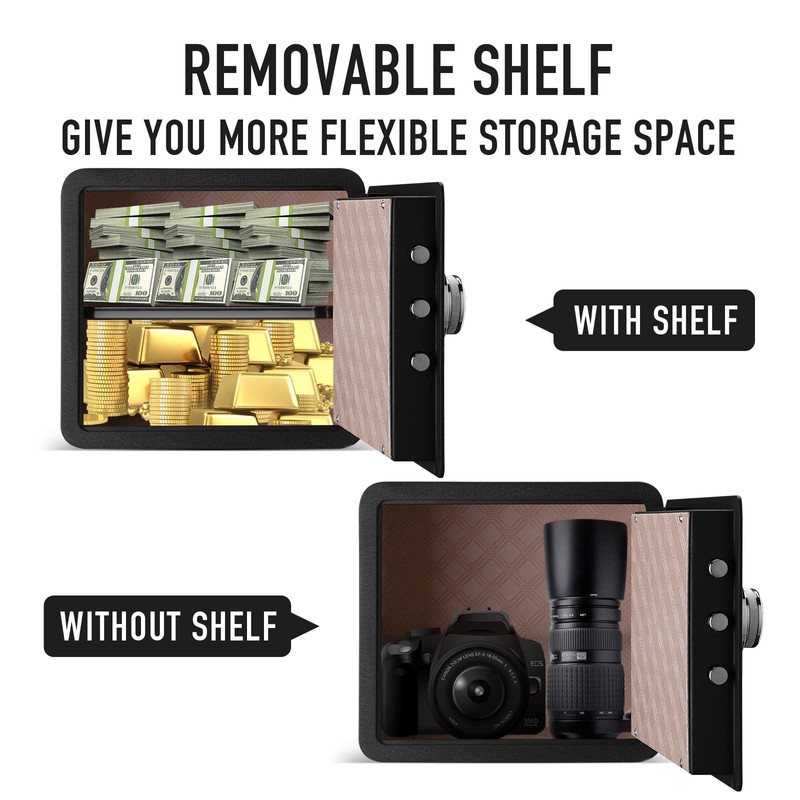 - ✅【BETTER CONFIGURATION】: As soon as you open the security box, the light will light up and go out automatically after 30 seconds. The inside of the safe is covered with leather to prevent wear and tear of valuables. The safe box also has an emergency external battery pack. When the internal battery is exhausted, you can plug it in to provide emergency power.