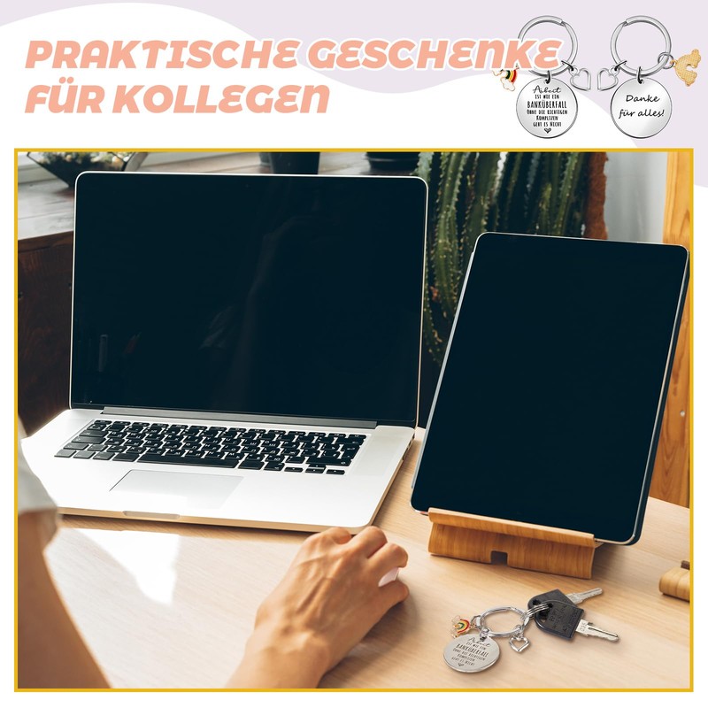 - DOUBLE SIDED ENGRAVING The thank you keychain is printed with the text "Work is like a bank robbery. Without the right accomplices it can't work." and "Danke für alles!" engraved; these humorous and heartwarming words not only bring joy, but also express gratitude to colleagues