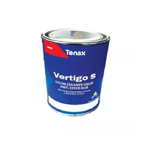 Tenax Vertigo S Knife Grade is the latest generation of vinyl ester glue formulas. Vertigo S Knife Grade is virtually completely clear in film during application. Tenax Vertigo S is extremely strong with excellent adhesion with a very fast cure time of about 20 minutes. Tenax used the latest raw resin materials to make Vertigo S very low yellowing in outdoor or UV applications. Vertigo S cures shiny and is very easily polished. Vertigo S takes color very well. Just a drop goes a very long way for easier color matching. Vertigo S is a drip-less formula glue. So it will stay on the edge and not on the floor. Vertigo S in the can looks very very light in color and when spreading it becomes almost invisible. This characteristic makes working with light and white colored materials much easier. With a gel time of 4-5 minutes and a full cure in about 25 minutes, the Tenax Vertigo S will keep the production pieces moving through the shop.