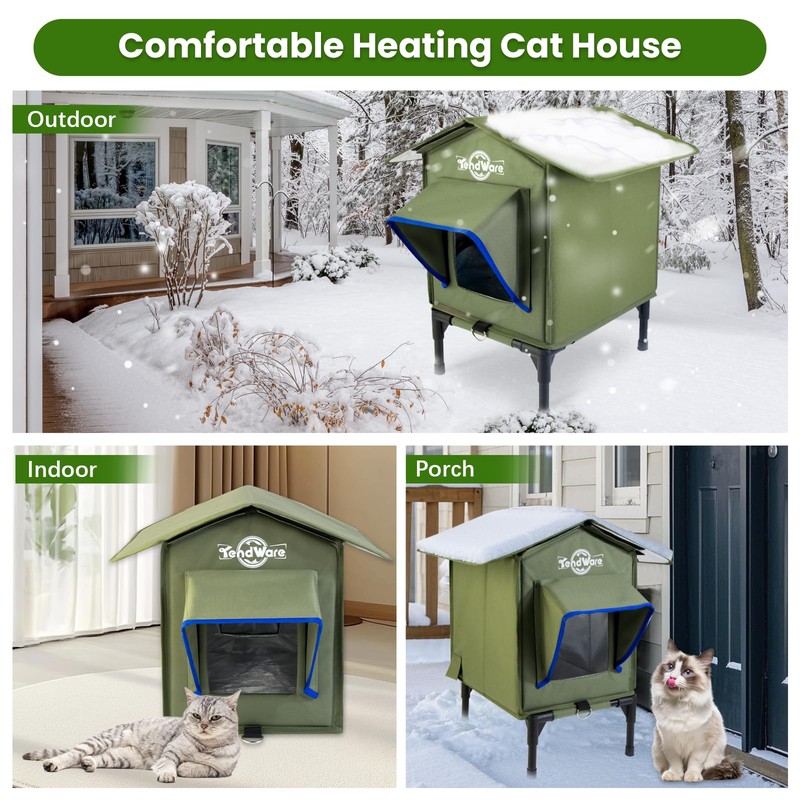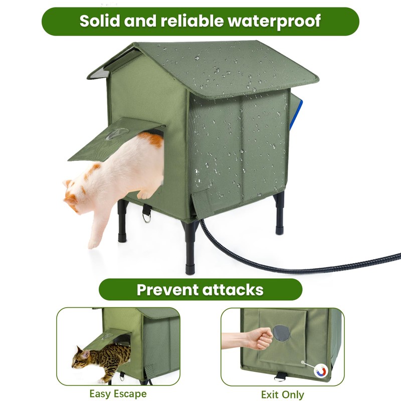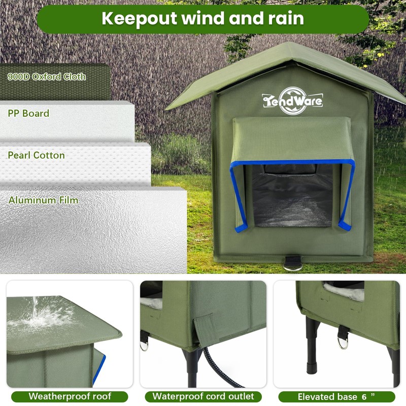 - 【Prevent Moisture and Stay Dry】 Tendware Cat houses for outdoor is constructed of waterproof fabric such 900D oxford cloth, PP board,pearl cotton, aluminum film, keep warm and weatherproof. The sides of our heated cat house for outside are stitched together, no risk of water seepage. Unlike other cat houses that use Velcro splicing. The bottom is equipped with elevated base to prevent the bottom water from seeping into the house. And waterproof cord outlet can also avoid water leakage.