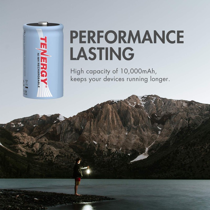 - Tenergy rechargeable D cell battery has 10,000 mAh capacity and keeps your devices running longer.