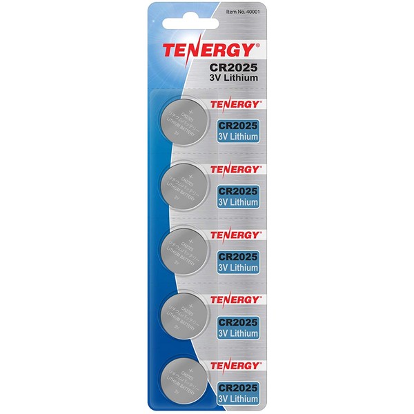 Tenergy 3V CR2025 Batteries, Lithium Button Coin Cell 2025 Battery, Ideal for Key FOBs, calculators, Coin counters, Watches, Heart Rate Monitors, Glucometer, and More - 5 Pack
