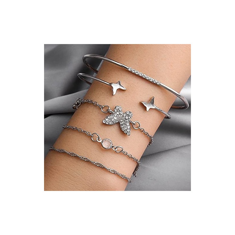 tenghong2021 5PCS Bohemian Butterfly Layered Crystal Bangle Stackable Wrap Set PendantAdjustable Open Bracelet for Women -Silver