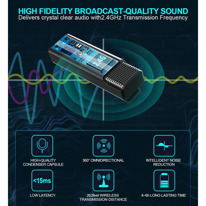 - The storage box function: also serves to charge the transmitter. After the storage box is fully charged, the transmitter can be charged a maximum of 4 times, and each time maximum supports the transmitter to work about 4-6 hours. Provides professional full band audio with 48KHz stereo CD quality, built-in high sensitivity microphone to make your sound clearer without effort, even in noisy environments.
