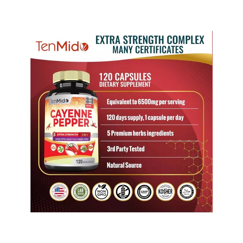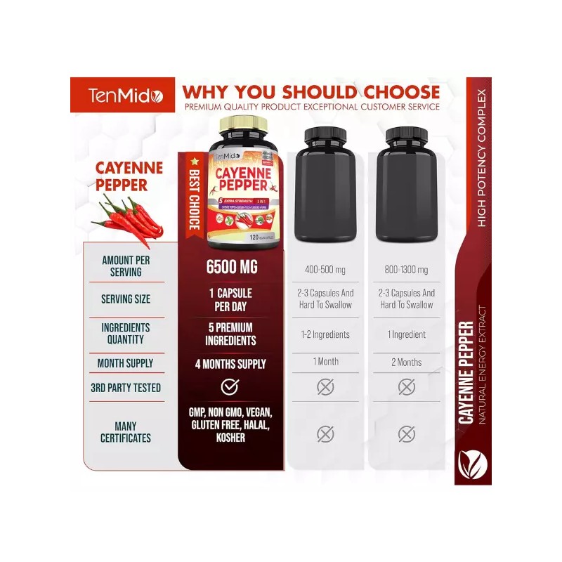 Tenmido Cayenne Pepper Extract Capsules 6500mg, 4 Months Supply with Ginger, Turmeric Cu