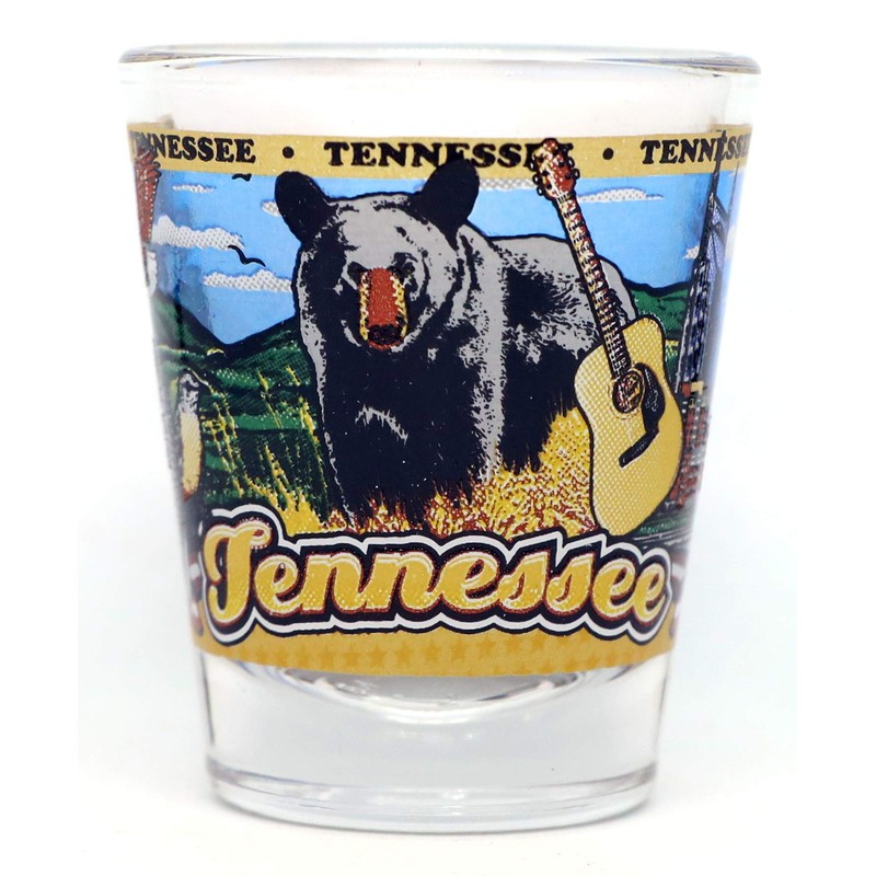 Here's a very rare and hard to find souvenir collectible wraparound shot glass from Tennessee. It's a 5x6cm style shot glass measuring 2.25" tall and 1.8" in diameter.