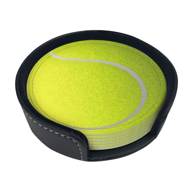 Tennis Ball Coasters for Drinks with Holder Round Leather Coasters Set of 6 Cups Mugs Mat Pad for Home Kitchen Bar