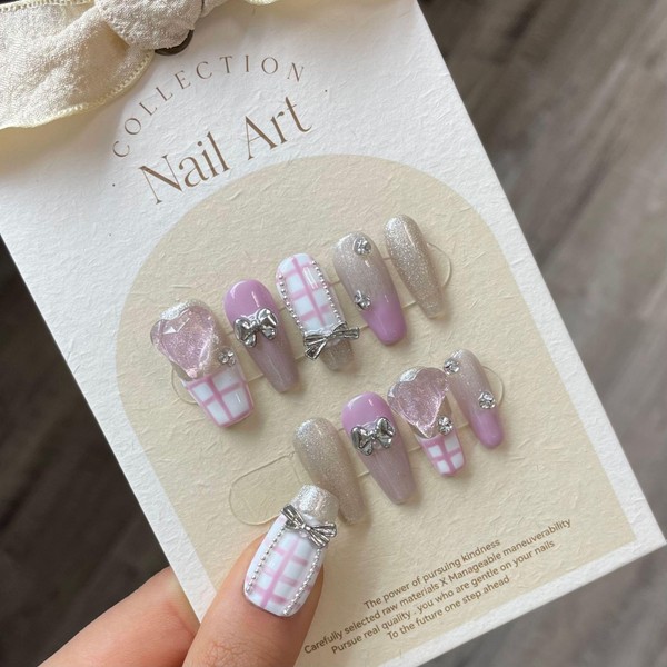 TENPAL Grey Pink Nails,Acrylic French Tip Press on Nails Medium,Soft Gel Fake Nails With Bow Ties, Glitter Coffin Nails With Plaid Designs,Y2K Stick on Nails For Women Girls,Cute Nails,XS Size