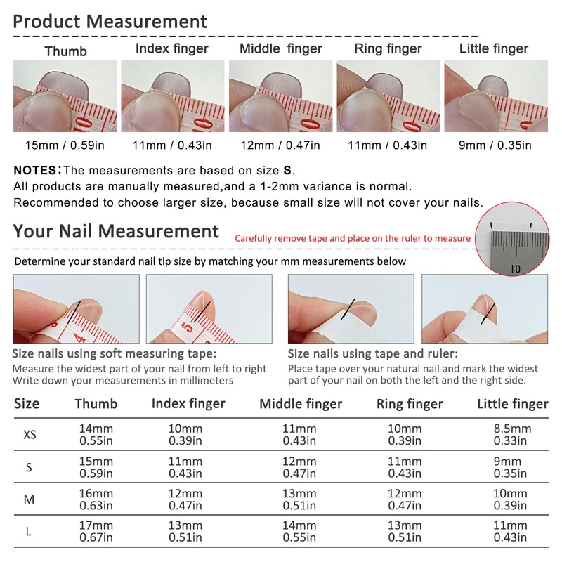 - [How to use and how to remove]: Measure your own nail length according to our size chart and choose the size that best suits you. After receiving acrylic press on nails, follow our instructions. So that fake nails can last for many days. However, as professionals, we do not recommend that you wear it for a long time. Just like makeup, we hope that you can give your fingernails more breathing space.