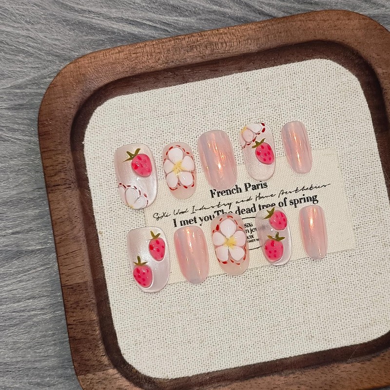 TENPAL Press on Nails 10Pcs with Tools Kit,3D Strawberry Spring Summer Pink Aurora Fake Nails,Cute Floral Almond Short Nails,Full Cover False Nails Simple Blush Glue on Nails Sweet Summer Nails(XS)