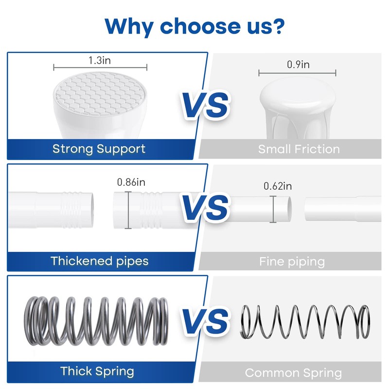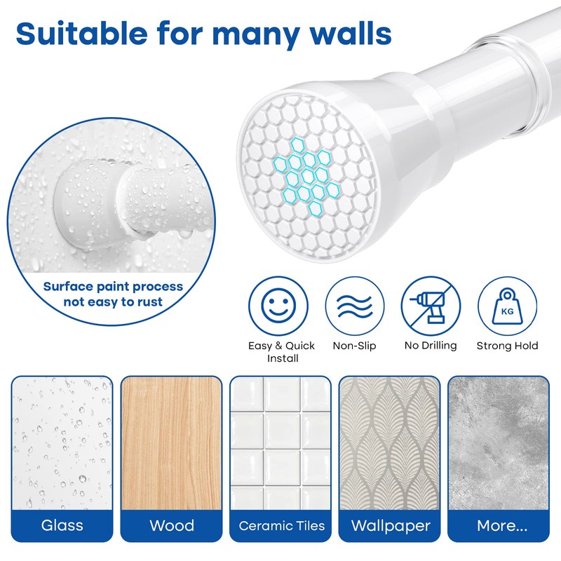 - 【Suitable for All Kinds of Walls】QINGYUN tension rod Rubber Anti-skid Base is very firm, Suitable for Glass, wooden walls, marble, lime wall, and ceramic tile.