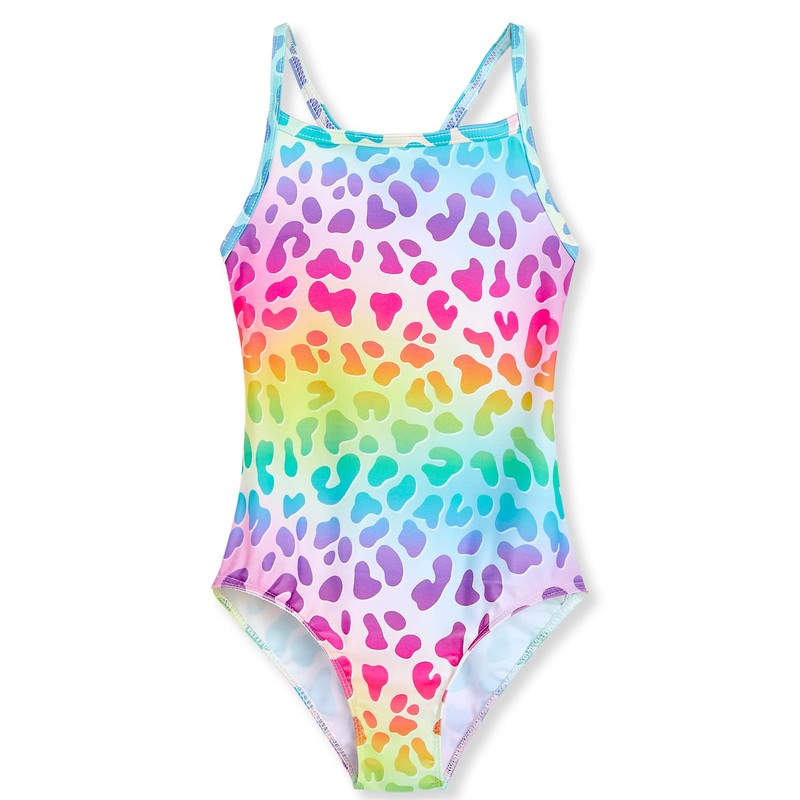TENVDA Girls Swimsuits One Piece Swimwear for 6-7 Years Old Little Kids Rainbow Leopard Printed Swimming Surfing Sports Bathing Suits