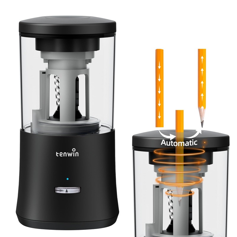 tenwin Electric Pencil Sharpener, Fully Automatic Pencil Sharpener for 6-8mm Colored Pencils, Hands-Free Rechargeable Sharpener, Fast Sharpening, No Uneven Tips, Also for Short Pencils, Black