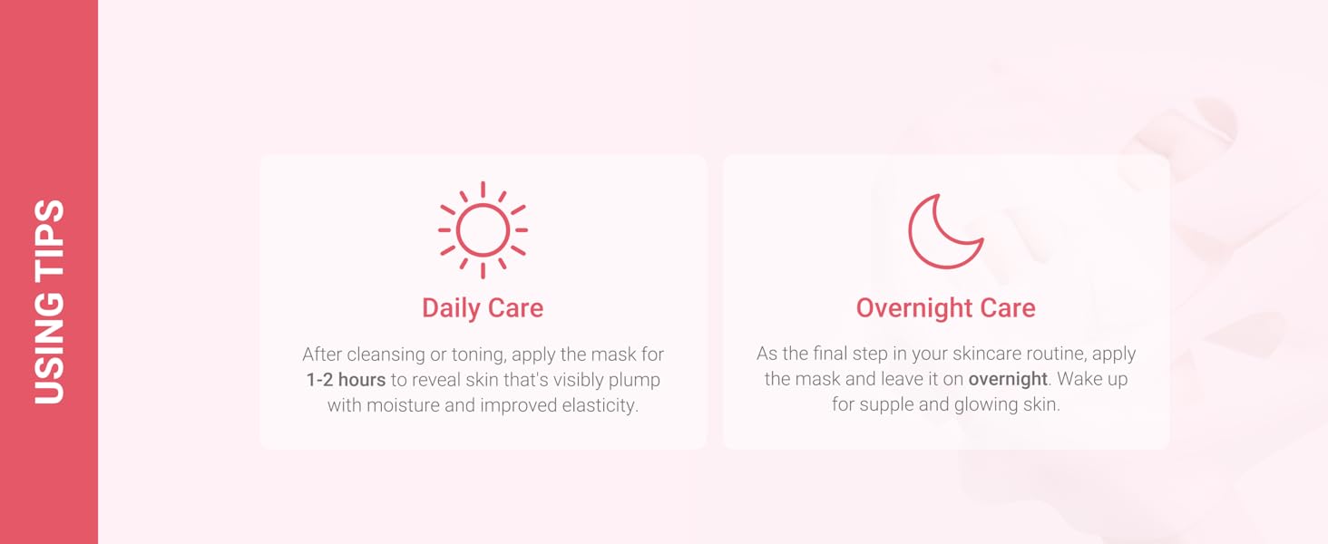- HOW TO USE: For best results, apply the mask to your clean face and leave it on for up to 2 hours. The gel will absorb into your skin, providing targeted hydration and nourishment. Can be used overnight for enhanced benefits.