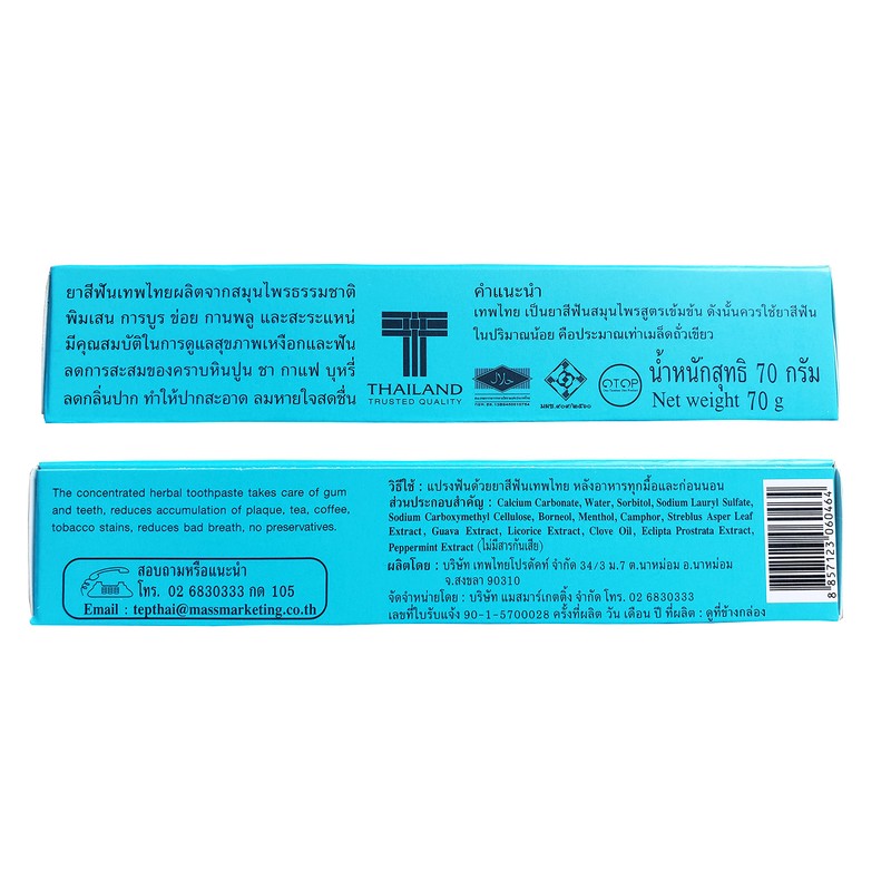 • Tepthai is made from natural herbs for example Borneol, Camphor, Streblus Asper Bark, Clove Oil, Mint, etc. Tepthai contains many herbal ingredients which look after all oral hygiene. i.e. teeth and gum protection, reduction of plaque, tea, coffee, tobacco stains and bad breath.