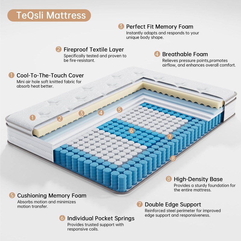 • All-Night Comfort & Trusted Support: The Perfect Fit memory foam instantly adapts to your unique shape, offering a supportive and conforming feel. Designed with breathable foam, it relieves pressure points, promotes airflow, and enhances overall comfort. The TeQsli hybrid mattress delivers the quality you expect, paired with trusted support and responsive coils, ensuring a satisfying night's sleep.