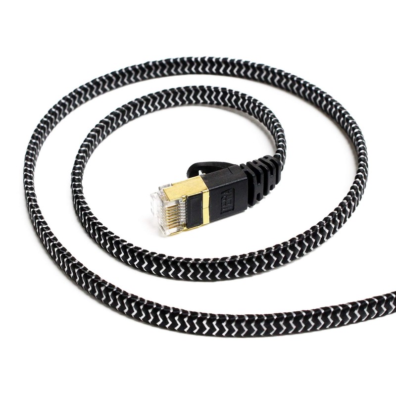 Tera Grand - 12FT - CAT7 10 Gigabit Ethernet Ultra Flat Patch Cable for Modem Router LAN Network - Braided Jacket, Gold Plated Shielded RJ45 Connectors, Faster Than CAT6a CAT6 CAT5e, Black & White