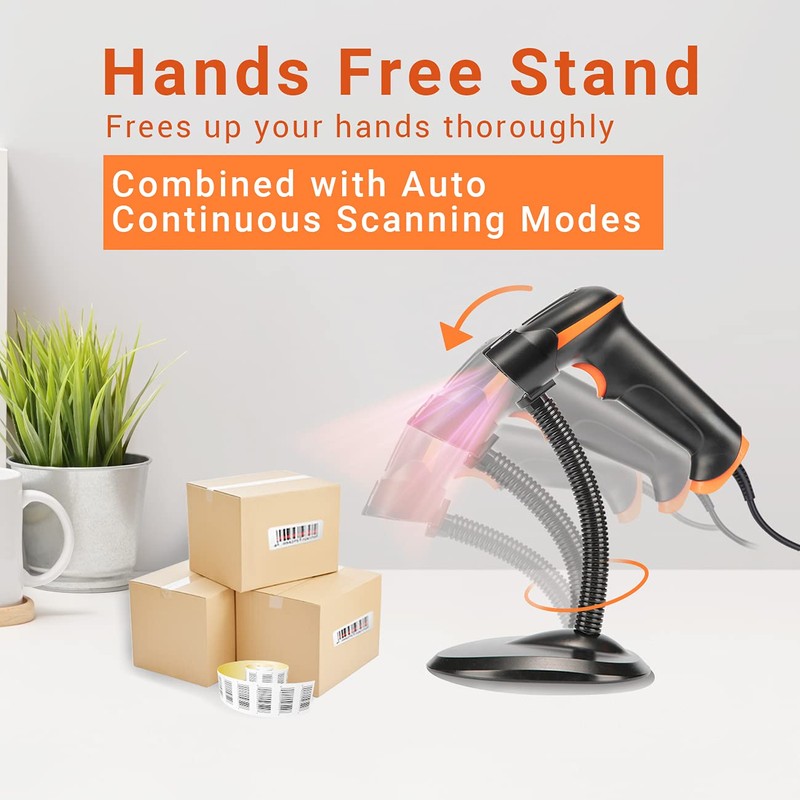 - 【2 Scan Modes, Hands-Free Design】Easily switch between manual scanning and automatic continuous scanning by scanning the provided barcodes. The sturdy barcode scanner stand allows hands-free operation.