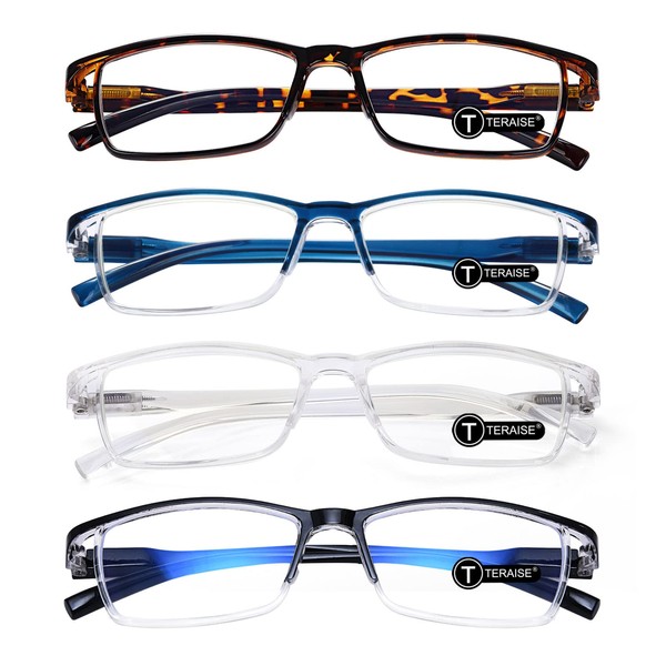 TERAISE 4 pairs Anti-blue Light Computer Reading Glasses with Spring Hinge Fashion(+250, Leopard+Blue+Clear+Black)