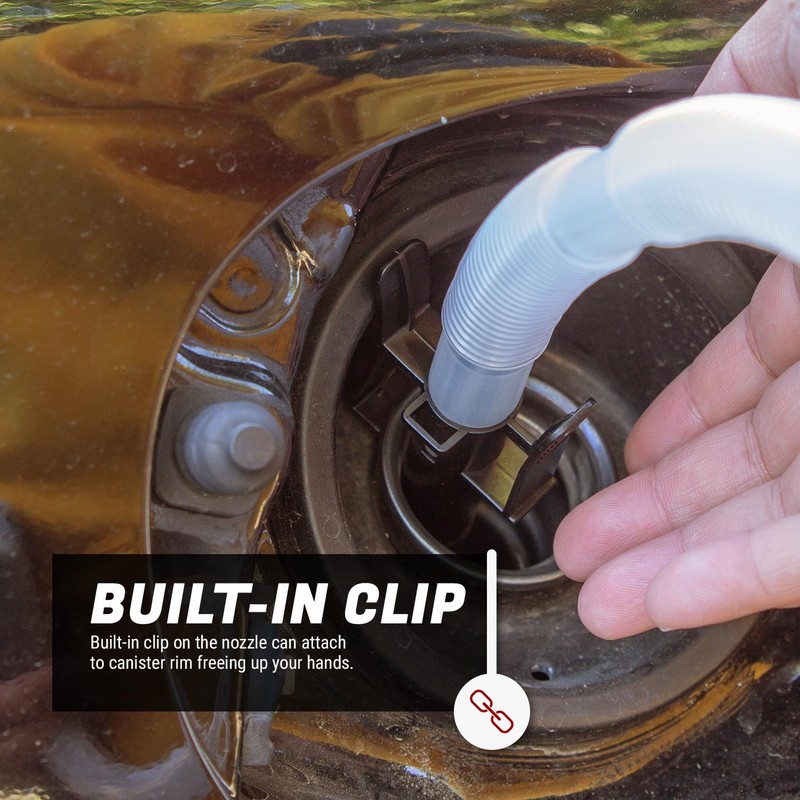 - DURABLE | Constructed of Polypropylene (PP) Polyethylene (P.E) & Acetal for greater durability - Flexible 18-inch (1.5ft) Discharge Hose + 5.5-inch Nozzle for irregular containers - Discharge Hose Holder: Built-in nozzle holder for safe and convenient way of storing the discharge nozzle