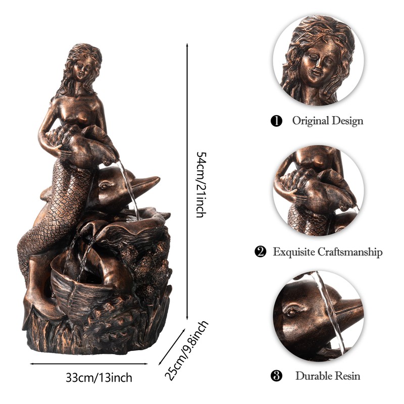 - 【Original Design】 This fountain features beautiful mermaids, cute dolphins, and a 3-level water flow design that mimics the sound of a real waterfall. Water flows down from each layer of shells or conches, creating a circular, gentle, and soothing sound that adds a serene atmosphere to your indoor and outdoor environment.