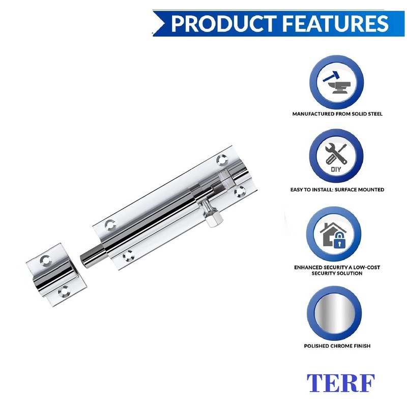 TERF Door Bolt Polished Chrome Barrel Slide Lock Bolt 100mm [4 inch] Door Latch with Screws, Ideal Door Locks for Internal and External Doors for Bedroom Bathroom Toilet Shed Gate Cupboards Cabinets Multi Purpose Use