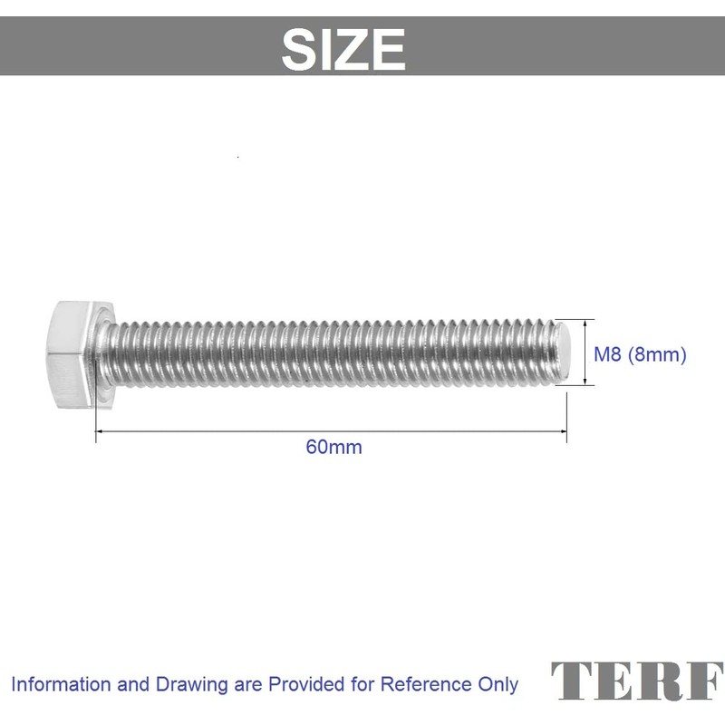 TERF® M8 X 60mm Hex Bolts Fully Threaded Set Screw M8 (8mm) X 60mm Hex Head Cap Hexagonal Bolts - Pack of 10