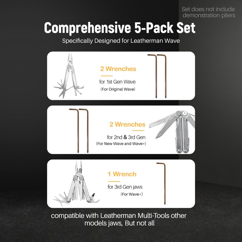 - Comprehensive 5-Pack Set – Includes 2 wrenches for Gen 1(For Original Wave), 2 wrenches for Gen 2 and Gen 3(For New Wave and Wave Plus), 1 wrench for Gen 3 jaws(For Wave Plus), and is compatible with other Leatherman Multi-Tools jaws, But not all are compatible