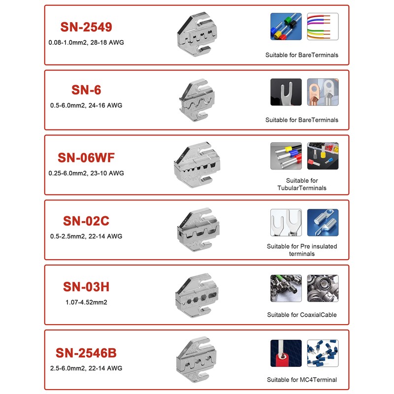 The plier jaws are replaceable and equipped with 7 plier jaws. Different jaws can be used according to needs. (SN-58B jaw has been installed.)