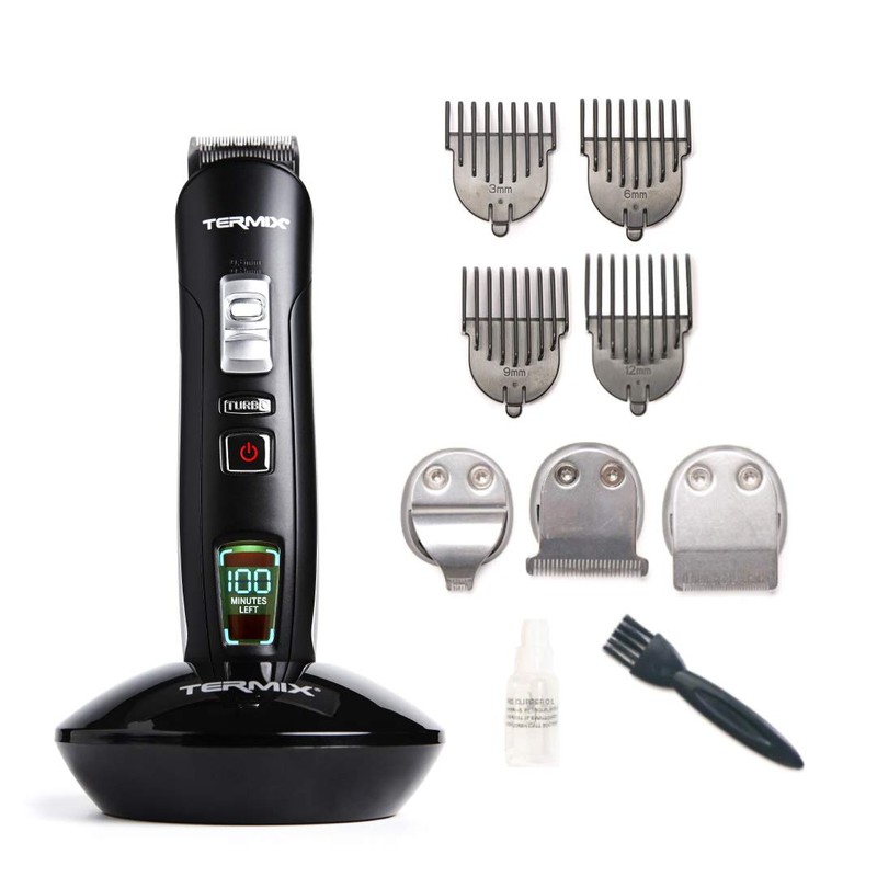 - The kit contains 3 different blades, slip hand drawing 4, attachments (3/6/9/12 mm), charging station, cleaning brush and oil