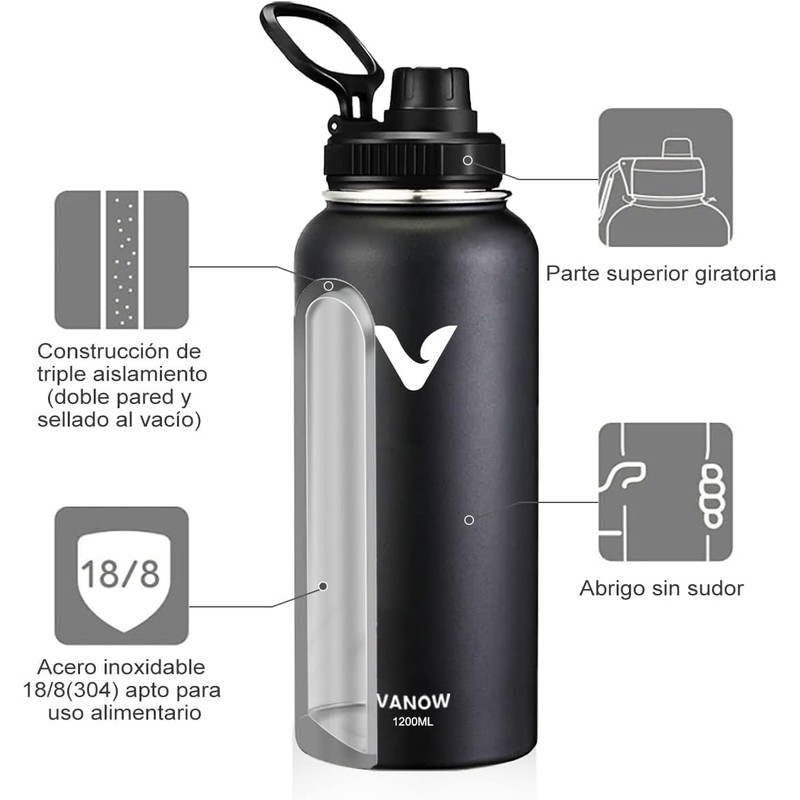 Termo de Acero Inoxidable 1.2L EASYTAO | Mantiene Bebidas Frías 24h y Calientes 12h | 2 Tapas (Pajilla y Chug), Antigoteo, Asa de Transporte, Negro