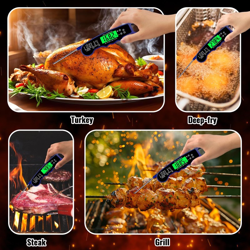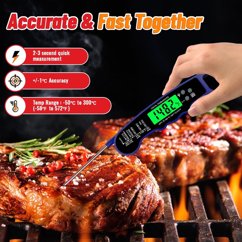 Termómetro digital para carne IP67 impermeable para cocinar y hornear, termómetro de carne de lectura instantánea con luz de fondo, función de sujeción e imán para cocina, carne de res, parrilla,