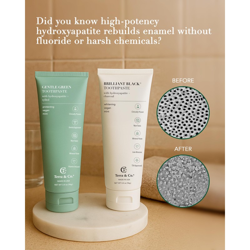 - High Potency Hydroxyapatite: Terra & Co.'s enamel repair toothpaste is made with biocompatible minerals for the prevention of micro-cavities. Naturally occurring minerals make up 97% of your tooth enamel and 60% of your bones. Why is this so important? As your teeth recognize this natural component, it's easier for them to intake hydroxyapatite and remineralize lost minerals while filling microscopic 'holes'.