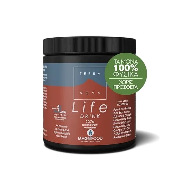 The Terra Nova Life Drink nutritional supplement is a nutritional formula with superfoods, essential antioxidants, enzymes, prebiotics and probiotics. Contains a number of ingredients, such as spirulina and chlorella, omega 3-6-9 from flaxseed, borage and olive oil. It also contains 10 varieties of fresh vegetables, 10 different antioxidant berries (sea buckthorn, acai berry, etc.) and 2 types of mushrooms (shitake & ganoderma). Delivers a wide variety of vitamins and minerals from rice bran, 7 different digestive enzymes.