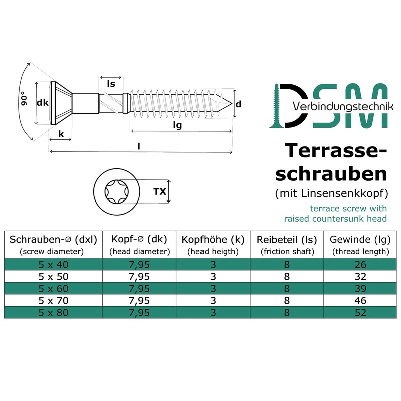 - Technical data: screw diameter = 5 mm | length = 40 mm | head diameter = 7.95 mm | head height = 3 mm | partial thread (wood thread) with peeling ribs and TX drive for tumble-free screwing and ideal power transmission