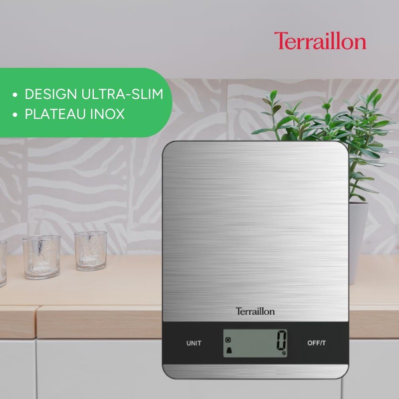 TERRAILLON - SLIM STEEL - Electronic Kitchen Scale, Large LCD Display, Stainless Steel Plate, Ultra Thin Design, Capacity 5kg, Scale 1g, Tare - Convert Liquids, Automatic