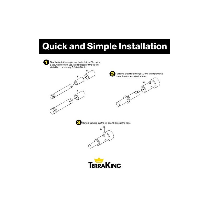 - BENEFITS OF KIT: If you have a quick hitch for your tractor, this bushing kit is a must-have for any attachment you want to connect to the back of your tractor. Many original 3-point hitch set-ups have thinner attachment pins that can cause your implement to jump out of the hitch. You’ll find the advantages of TerraKing’s Quick Hitch Bushing Kit with your box blade, back blade, rotary cutter, tiller, and more.