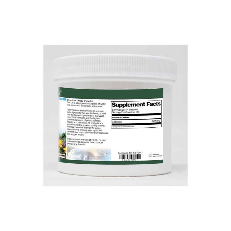 Cabbage Powder (4 oz, ZIN: 519443)Packaged in the United States in a GMP certified facility (Good Manufacturing Practice).No fillers.Manufacturer: TerraVitaSize: 4 ozConvenient Powder format.Ingredients: Cabbage