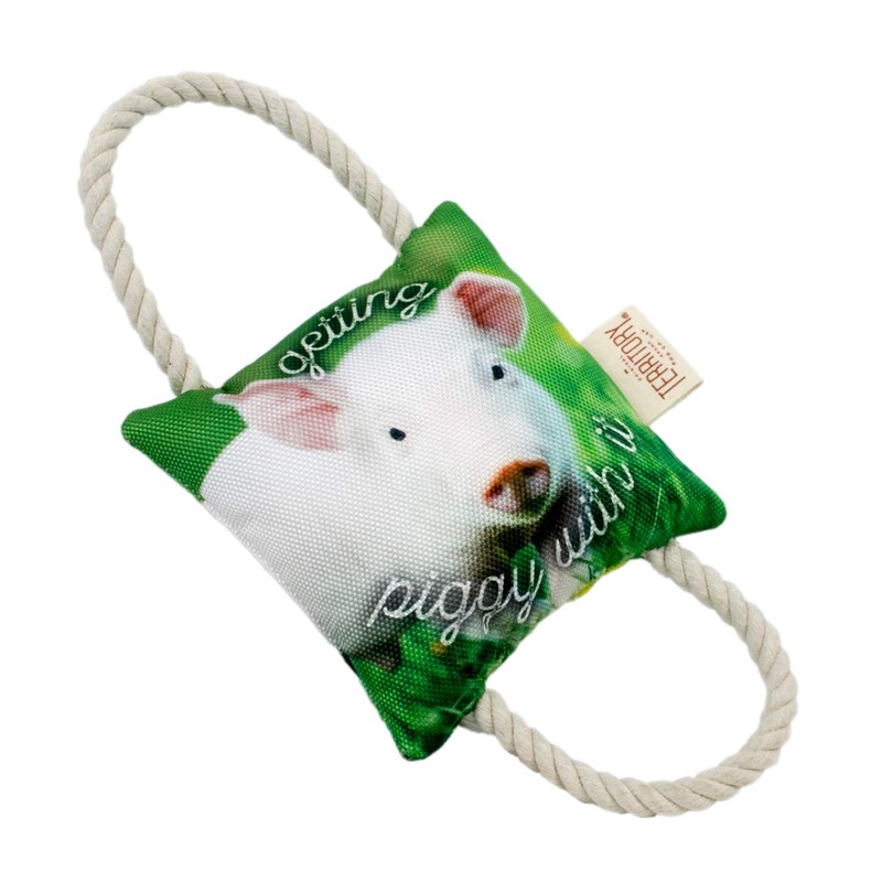 Mark Your Territory on the farm with Original Territory's Getting Piggy 2-Way Tug Toy! This tug dog toy is made from durable materials such reinforced fabric and cotton & jute rope for long-lasting interactive play. In addition, we've also added a squeaker for exciting search-and-find fun. Great for fetch, tug-of-war, and other supervised play fun, your pup will be too busy getting piggy with it!