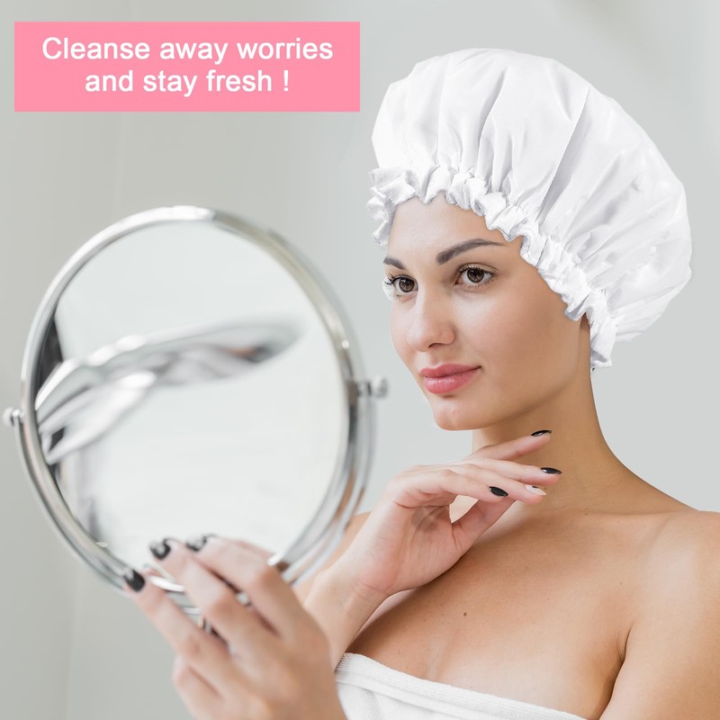 - Double Layer Shower Cap: The waterproof shower cap is made of two layers, the outer layer is waterproof EVA cloth, and the inner layer is terry cloth which absorbs moisture and steam to keep your hair dry and prevent frizz during showering