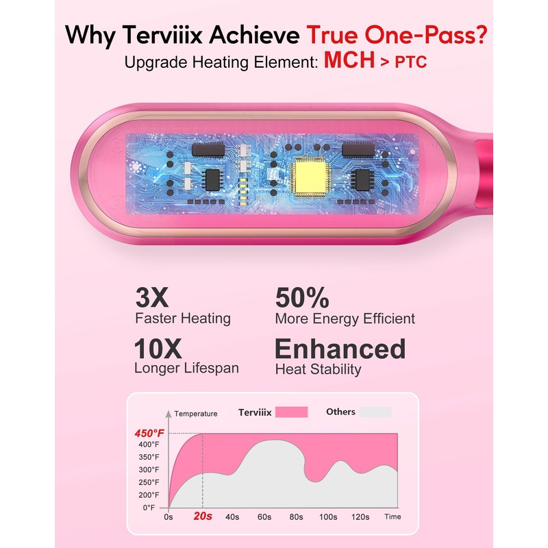 - Comb and Flat lron in One:Terviiix Hair Straightener Comb brings together the convenience of a comb and a flat iron. Designed with your comfort in mind, its ergonomic grip ensures easy handling while straightening. Its advanced MCH heating technology delivers fast and consistent heat(Max F), giving you the perfect tool for effortlessly straightening and smoothing your hair