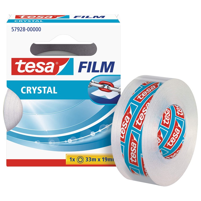 - Tesa Film Crystal self-adhesive tape: premium quality tape, ideal for a variety of applications such as office work, packaging, gift wrapping or crafts