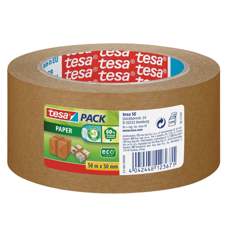 - Tesapack EcoLogo paper packaging tape,<br/>50 mm x 50 m, brown, unbleached, smooth paper,<br/>Recycled, detachable by hand, roll adhesive/glue<br/>Made up of 60% Organic Materials, no solvent<br/>(57180-00000-02/5718-0-2/Old: 57180-0-1/57180-00000-01)