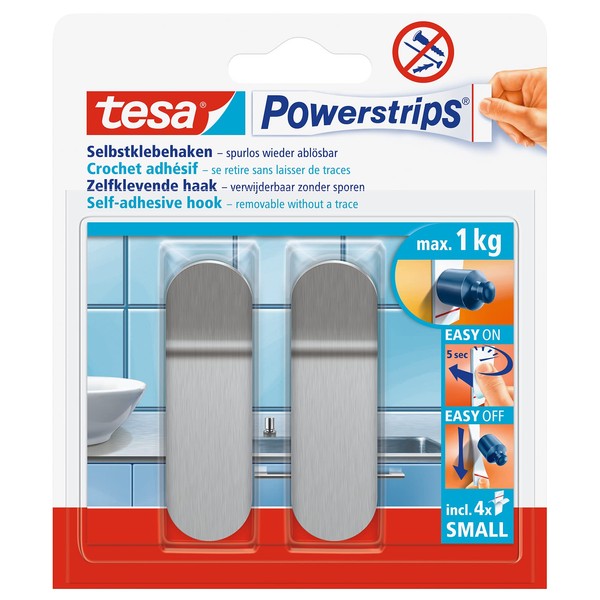 - Box contents: 1 x tesa Powerstrips hook small metal, 2 x adhesive hooks, 4 x tesa Powerstrips small adhesive strips, colour: matt chrome, material: metal