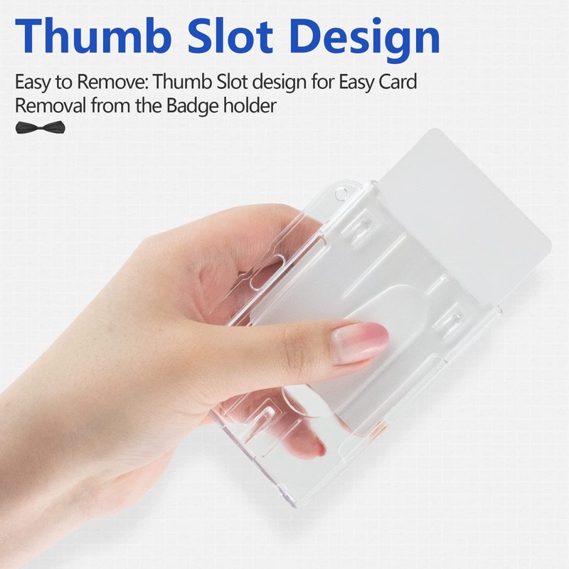 - 【Unique Design】: This id badge holder can be paired with a lanyard or a retractable badge clip, with a thumb groove in the middle, you can easily take out the cards, each can hold 2 cards, which is very suitable for passes, bus cards, and work cards.