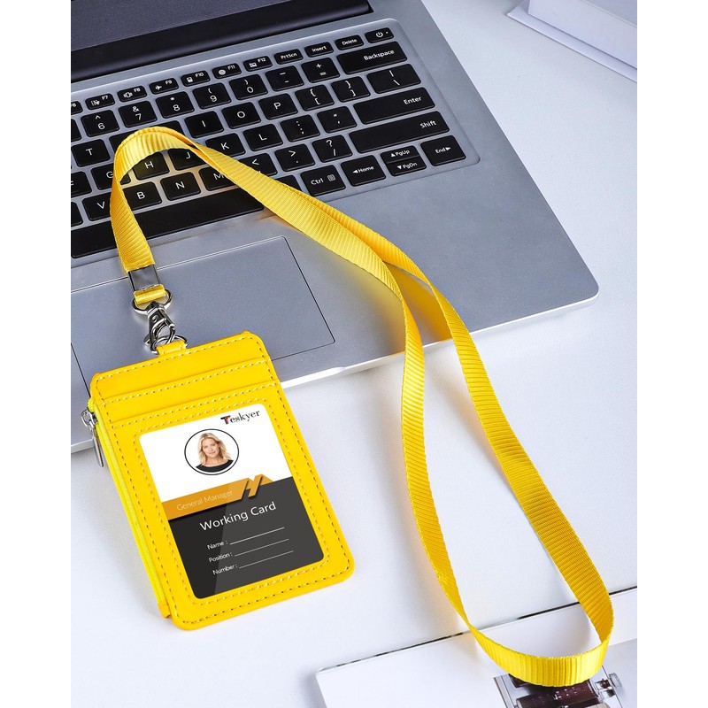 Teskyer Badge Holder with Side Zip Pocket, Multiple Card Slots Leather ID Holder Wallet with Neck Lanyard for Office Staffs, Teachers/Students, Workers, Cruise Cards, Bus/Metro Cards, Bright Yellow